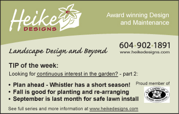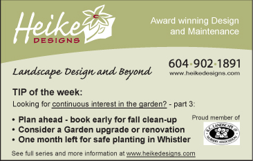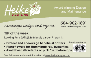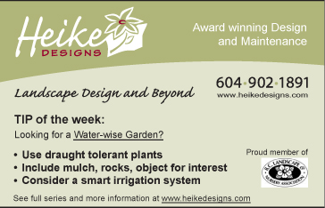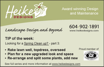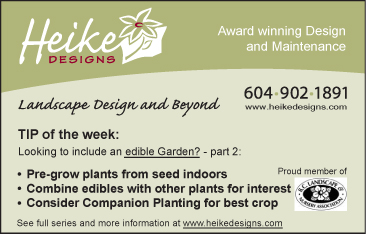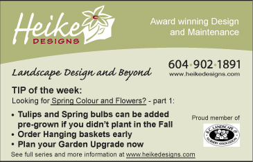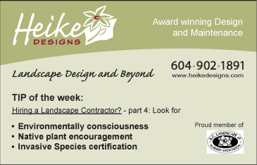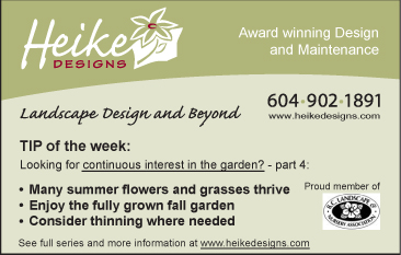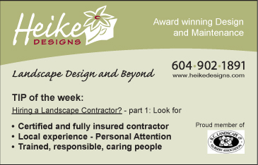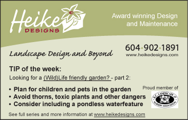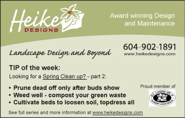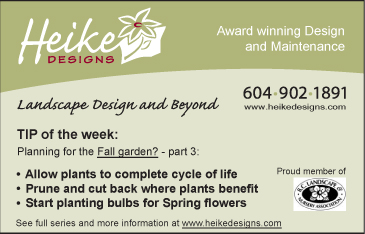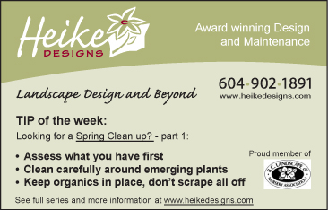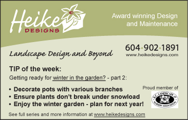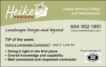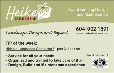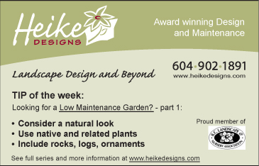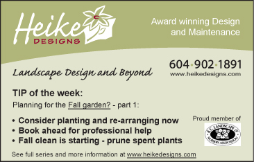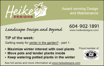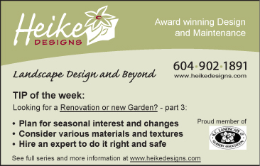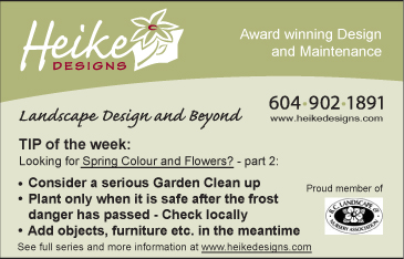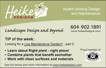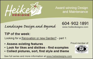 Weekly Tips April 19 2012 Spring colour and flowers - pt1 April 26 2012 Spring colour and flowers - pt2 May 03 2012 Spring clean-up - part 1 May 10 2012 Spring clean-up - part 2 May 17 2012 Spring clean-up - part 3 May 24 2012 Renovation or new garden? part 1 May 31 2012 Renovation or new garden? part 2 June 07 2012 Renovation or new garden? part 3 June 14 2012 Hiring a landscape contractor - part 1 June 21 2012 Hiring a landscape contractor - part 2 June 28 2012 Hiring a landscape contractor - part 3 July 05 2012 Hiring a landscape contractor - part 4 July 12 2012 Low maintenance garden - part 1 July 19 2012 Low maintenance garden - part 2 July 26 2012 Water-wise garden August 02 2012 Edible garden - part 1 August 09 2012 Edible garden - part 2 August 16 2012 Wildlife friendly garden - part 1 August 23 2012 Wildlife friendly garden - part 2 August 30 2012 Continuous interest in the garden - pt 1 Sept 06 2012 Continuous interest in the garden - pt 2 Sept 13 2012 Continuous interest in the garden - pt 3 Sept 20 2012 Continuous interest in the garden - pt 4 Sept 27 2012 Fall garden - part 1 Oct 04 2012Fall garden - part 2 Oct 11 2012 Fall garden - part 3 Oct 18 2012 Fall garden - part 4 Oct 25 2012 Winter in the garden - part 1 Nov 01 2012 Winter in the garden - part 2 Latest News Heike Designs on Facebook